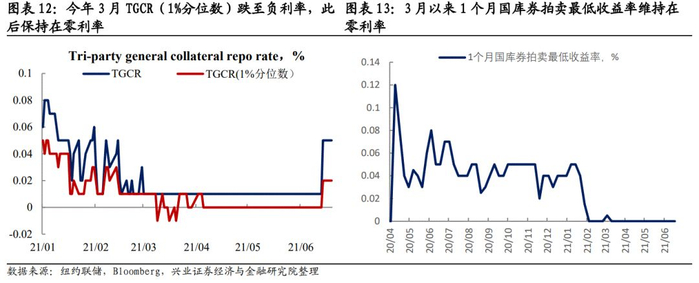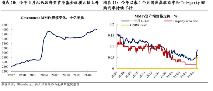 MMFs“资产荒”是导致ONRRP规模上升的直接原因。传统存款市场上,MMFs无论在零售端还是机构端,都是银行的竞争者。银行reserves受限后,存款流向MMFs是一个自然的过程。美国货币基金改革后,government MMFs成为货基的主力,prime MMFs逐渐式微。今年3月以来 MMFs(后文均指政府型MMFs)规模上升了约3000亿,成为承接剩余流动性(non-performing liquidity)最主要的“cash pool”。MMFs的资产配置有三个主要方向:T-Bills、Repo或者ONRRP。MMFs规模扩张后,资产池并没有明显扩张,充足的流动性将短端国库券和Tri-party repo利率压至零附近,部分回购交易甚至已经出现负利率。MMFs在面临“资产荒”的情况下,与其接受负利率资产,不如把流动性存进美联储零利率的ONRRP工具里,这是3月以来 ONRRP 规模大幅上升的直接原因。