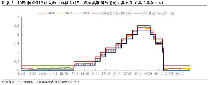 两大工具:IOER和ONRRP。前文已作详尽阐述,这里不再重复。在流动性过剩框架下,IOER 和ONRRP是货币市场利率体系的上下限。