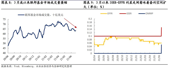 SLR豁免终止是存款机构reserves停止上升的主要原因。SLR(Supplementary Leverage Ratio)监管是巴塞尔协议III中的一部分,旨在对商业银行进行全面的资本充足率监管。SLR计算公式为 SLR= tier1 capital/ total leverage exposure,分母中包括了低风险的国债和在中央银行的存款。去年3月美联储为了应对新冠疫情冲击,放松资本金对商业银行扩表的约束,将美国国债和在美联储的准备金存款排除在SLR的计算中,豁免期至 2021年3月31日。因此我们看到美国存款机构在美联储的准备金存款从去年3月的1.7万亿大幅升至今年3月3.9万亿。今年3月19日美联储宣布不再对 SLR豁免延期后,受冲击的不仅仅是美国国债市场,存款机构在美联储的reserves也受到SLR约束,因此我们看到今年3月以来reserves规模止步不前。此外今年3月以来联邦基金市场成交量下降和IOER-EFFR利差走阔都是银行reserves规模受到SLR约束的有力证据:银行不得不缩减“借 EFFR,存 IOER”的套利规模,尽管这种套利的利润空间在扩大。
