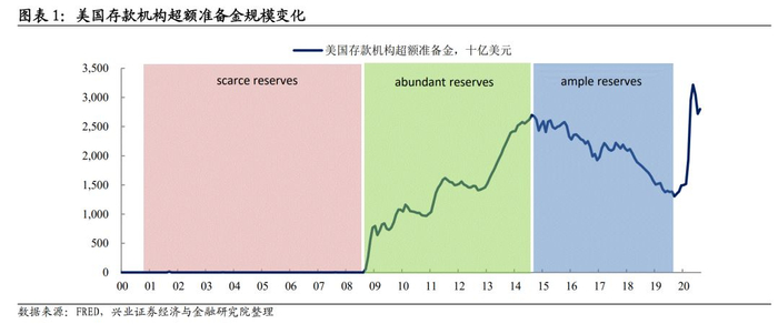 2008 年金融危机以来,美联储货币政策执行框架经历了 “流动性短缺”-“流动性过剩”-“流动性充裕”的转变。在货币研究中,流动性通常指存款机构存放在央行的超储。在2008年金融危机之前,美国超储利率长期保持在零,美国商业银行的超储规模很小,因此美联储执行的是一套流动性短缺(liquidity scarcity)框架。2008年金融危机之后,美联储进行了三轮QE,在美联储资产负债表的资产端体现为持有的美国国债、MBS等金融资产规模上升,在负债端体现为银行超储规模的大幅上升,该时期流动性短缺变成流动性过剩(liquidity abundance)。2013年12月美联储开始缩减购债规模,美国商业银行的超储规模也由流动性过剩向流动性充裕(liquidity ample)转变。