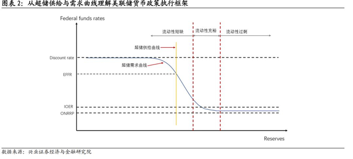 流动性充裕框架处于流动性短缺和流动性过剩之间的过渡地带。流动性充裕(ample liquidity)可以理解为流动性不多也不少,映射到超储需求曲线上,对应曲线下倾到平坦的过渡部位。该部位对应美联储从极度宽松的非常规货币政策退出的阶段(normalization),美联储为此创设了一套货币政策工具,即由IOER和ONRRP组成的“地板系统”(floor system)。从字面意思理解,在流动性充裕框架下,美联储的加息需要依靠“地板系统”向上托起EFFR。