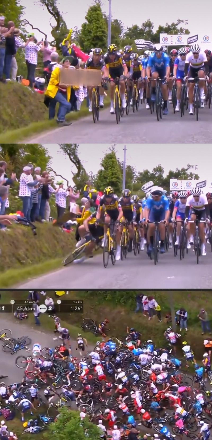 事故发生在第一赛段距离终点45公里处,当时有一个车迷手持纸牌侵入赛道,阻挡了正在快速骑行的车手。由于此时主集团骑行队伍庞大,随着车手托尼·马丁倒下后,紧跟其后的车手猝不及防,如多米诺骨牌效应纷纷摔倒。如此大规模的连环摔车在环法历史上也非常罕见。