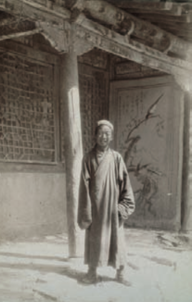 1908年,伯希和花了三个星期时间在藏经洞里挑选经卷,努埃特拍了三张照片记录下了这一历史性的 场面,这是其中的一幅。伯希和的语言优势给挑选经卷带来极大帮助