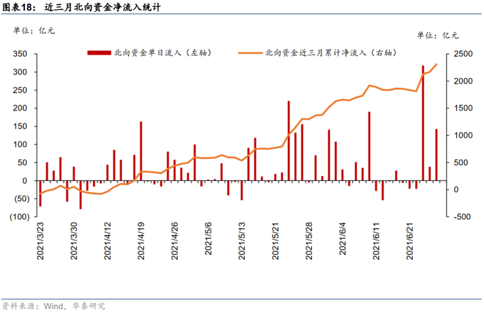 上周北向资金净流入,单周总计净流入454亿元,其中上周三单日净流入超过300亿元。近三个月(60个交易日)累计净流入2310亿元。