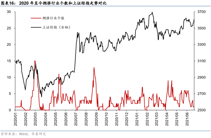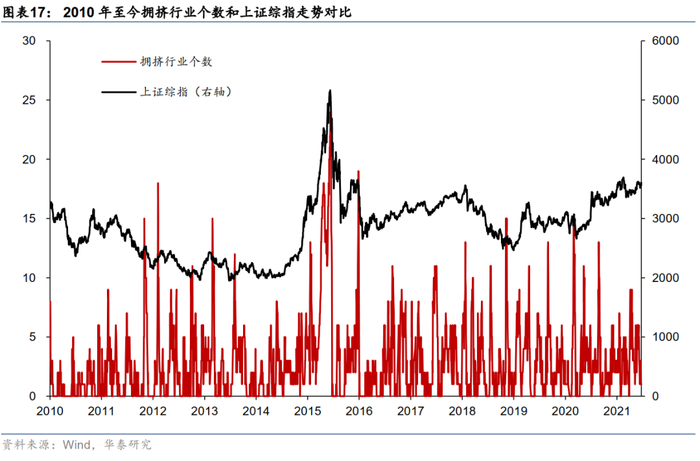上周市场持续反弹,大部分行业出现上涨,沪深两市日成交额在万亿水平,成交量略有上升。目前处于阶段性触底反弹时期,市场整体拥挤度不高,总计四个行业出现拥挤状态。