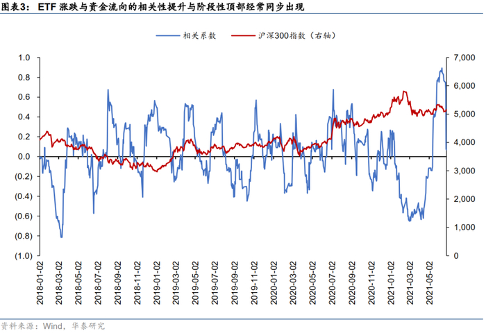 但同时我们也注意到,在指数上涨到阶段性顶部之前,也常会出现连续多日的资金净流入,我们认为这个净流入由第二类套利投资者引起。上涨到顶部阶段后,ETF在二级市场被普通投资者过度买入,非理性交易导致其二级市场价格高于一级市场参考净值IOPV,产生溢价套利机会,此时套利投资者从一级市场低价申购,并在二级市场卖出,扩大了ETF产品份额,产生了资金净流入。整体来看,这类投资者造成的资金流入流出通常与指数涨跌存在较为明显的正相关关系,若我们观测到正相关关系的出现,或可指示ETF在二级市场被过度买入,过去一段时间的指数上涨存在一定的非理性因素,需考虑股价接近阶段性顶部的风险。