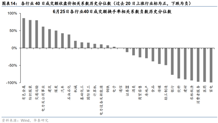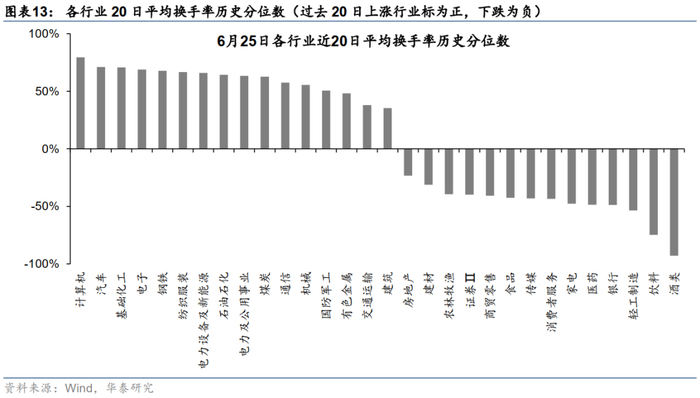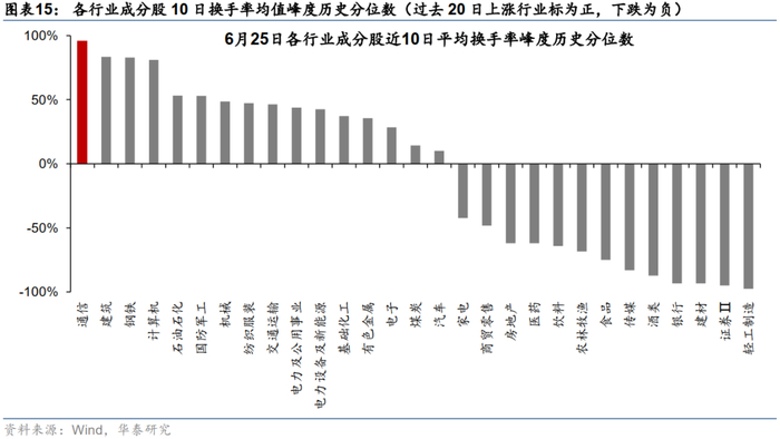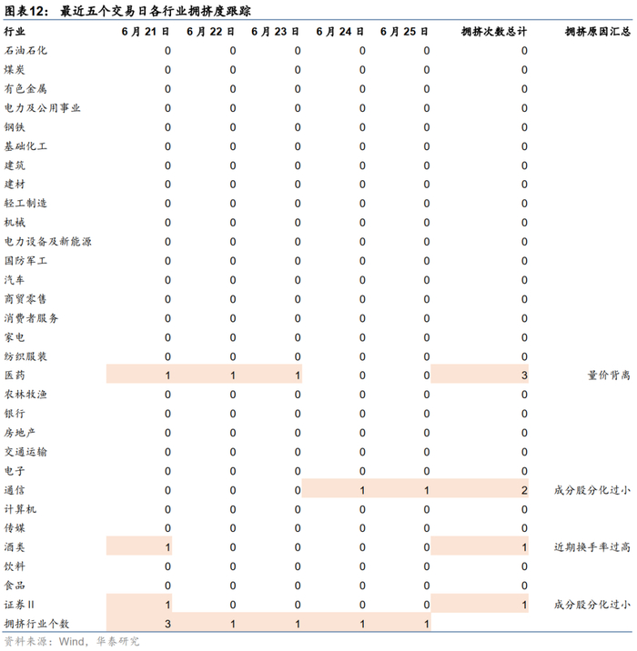 具体到行业层面来看,酒类行业近期换手率处于历史高位,存在拥挤交易风险,不过近阶段酒类行业已经较大幅度回撤,风险得到一定释放。医药行业出现了量价背离现象,面临着价格下行风险。通信、证券行业成分股分化过小,资金成交过于集中,存在拥挤现象。