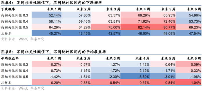 我们对高相关性出现后5、10、15、20、25和30个交易日内下跌概率及平均收益率进行了统计,并将结果汇总在下图表中。可以看到ETF涨跌与资金流向相关性超过阈值后的一段时间内,下跌概率显著高于总样本下跌概率。相关性阈值越高,未来区间内下跌概率越高,平均收益率越低。随着统计区间的拉长,下跌概率先增后减,在未来4周达到峰值;平均收益率先减后增,在未来4周达到底点。统计区间为4周、相关性阈值为0.5时下跌概率最高,达到82.14%,平均收益率也最低,为-3.59%。说明ETF日度涨跌和资金流向之间出现较高的正相关性后4周内,该ETF跟踪指数或将面临短期内下行风险。