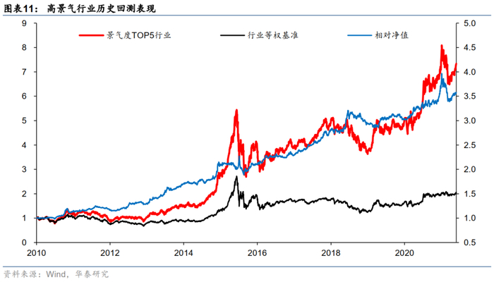 在华泰金工中观基本面轮动系列报告《行业配置策略:景气度视角》(2020-11-05)中,我们结合财务报表、业绩快报、业绩预告、一致预期等多个维度数据,构建了17个景气度指标来对各行业景气状态进行月度打分(该指标景气度向好打1分,恶化打-1分,无信号打0分)。综合得分越高的行业越景气。根据2021年5月31日的最新建模结果,全市场景气度大于零行业个数为26个,整个市场仍保持高景气状态。景气度打分排名前五的行业分别是:建筑、轻工制造、汽车、消费者服务、纺织服装。