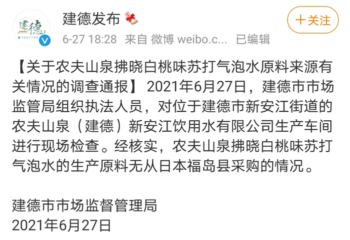 据浙江建德市监局发布的关于农夫山泉拂晓白桃味苏打气泡水原料来源有关情况的调查通报,2021年6月27日,建德市市场监管局组织执法人员,对位于建德市新安江街道的农夫山泉(建德)新安江饮用水有限公司生产车间进行现场检查。经核实,农夫山泉拂晓白桃味苏打气泡水的生产原料无从日本福岛县采购的情况。