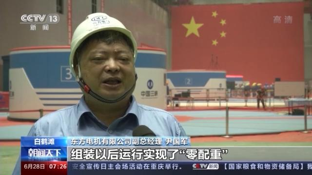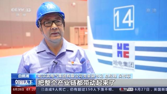 哈尔滨电气集团有限公司党委副书记、总经理吴伟章:由于我们有了100万的机组技术,把整个产业链全带动起来了,包括加工设备的设备机床,还有原材料、配套件等等。白鹤滩机组的投运,标志着我们在水电发电设备的技术达到世界先进水平,将来我们国家再做大的这种工程的时候,技术完全掌握在自己手里。