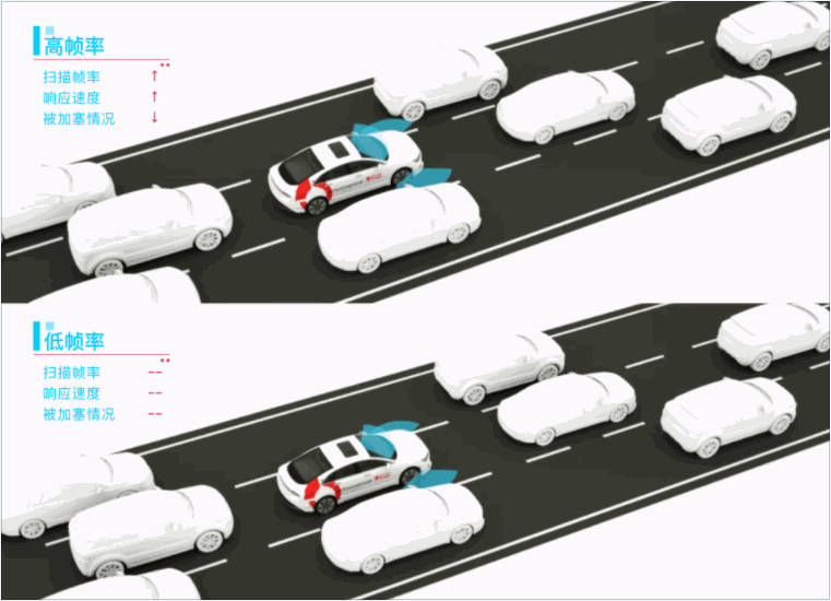 假如在拥堵路况下,两辆搭载激光雷达并行的智能驾驶车辆都开启了TJP功能,仅有普通10Hz帧率激光雷达的车辆由于响应慢,跟车空档大,很轻易被激光雷达帧率提升到20Hz的车辆Cut In,这会导致极其糟糕的用户体验。
