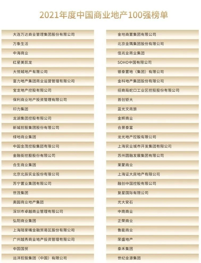 原标题:2021年度中国商业地产100强揭晓 排名前十位变化不大 来源:美通社头条