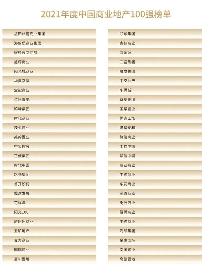 2021年度中国商业地产100强揭晓 排名前十位变化不大