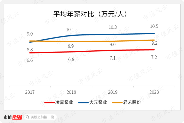 横向对比来看,近三年大元泵业的同期人均年薪在10万元以上,君禾股份的人均年薪在2020年缓慢提升至9.2万元。公司的人均年薪在可比公司中垫底。