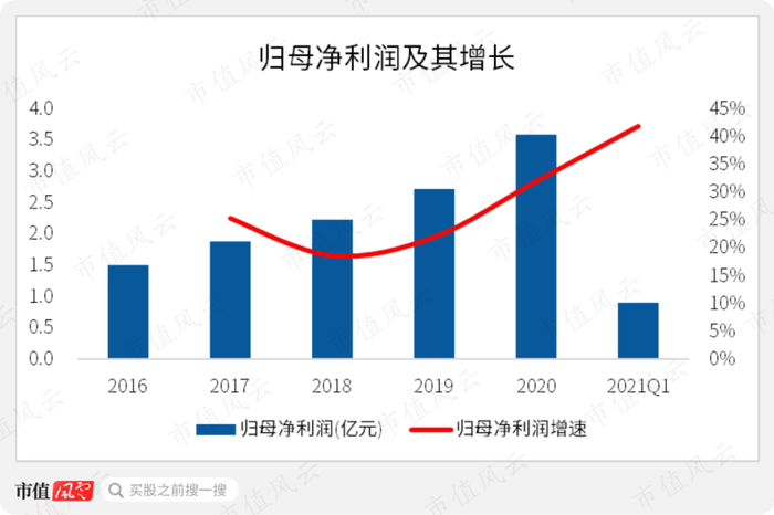 同期,公司归母净利润由1.5亿元增至3.6亿元,CAGR为24%;2021Q1,归母净利润为9087万元,同比增长42%。