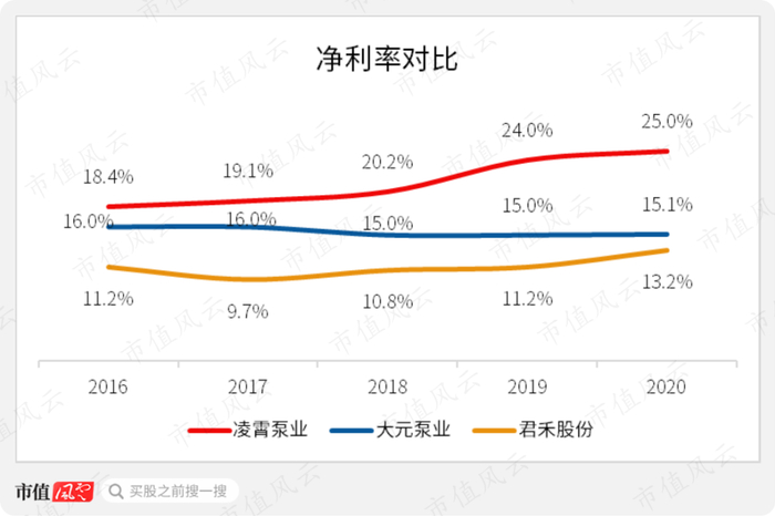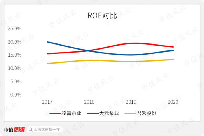 同期,大元泵业的净利率基本保持平稳,2020年为15.1%;君禾股份净利率有小幅提高,2020年为13.2%。