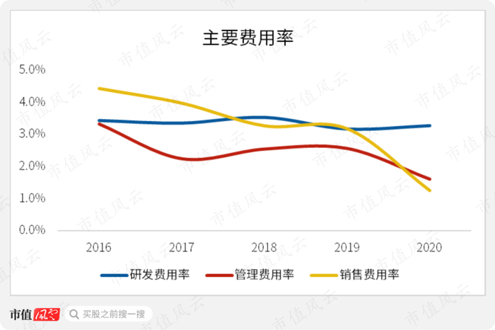 公司的研发费用率稳定保持在3%以上,2020年为3.3%。