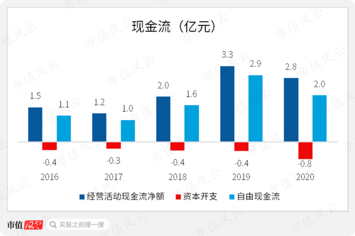 受其带动,公司的自由现金流也整体处于增长态势,但2020年受资本开支增加影响而有所降低,为2亿元。