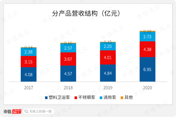 公司主营塑料卫浴泵、不锈钢泵和通用泵三大类,都属于民用离心泵。2017-2020年,水泵产品营收占比98%,主营业务突出。