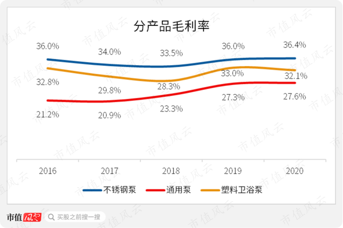 2020年,塑料卫浴泵毛利率基本保持平稳,2020年为32.1%,在三类产品中处于中间水平。