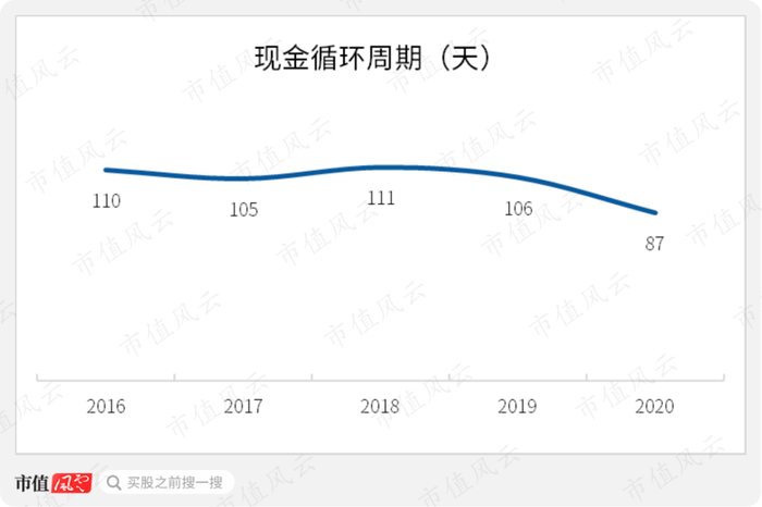 2016-2020年,公司的现金循环周期由110天降至87天,反映资金利用效率有所提高。