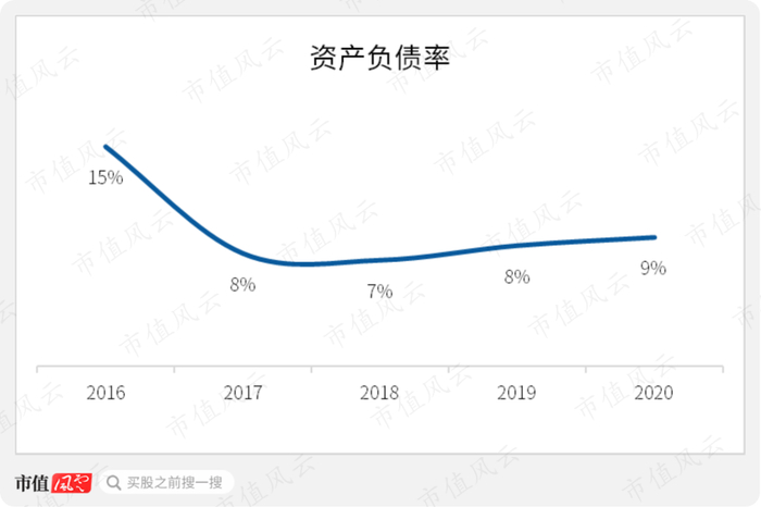 2016-2020年,公司的资产负债率由15%降至9%,负债水平极低,并且没有有息负债,财务状况优良。