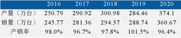 2016-2020年,公司水泵产量由251万台增至374万台,CAGR为11%;销量由246万台增至361万台,CAGR为10%。2020年公司产销率为96%,较2019年下降5个百分点。