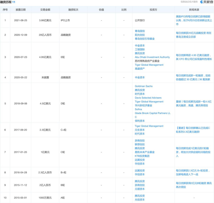 在本次IPO中,每日优鲜总计发行2100万股(含绿鞋2415万股)美国存托股票(ADS)。6月9日,每日优鲜在美递交招股书,摩根大通、花旗、中金公司、华兴资本、工银国际、Needham、富途控股老虎证券为此次IPO承销商。