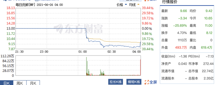 6月25日晚间,每日优鲜在纳斯达克市场正式挂牌。令那些打新中签者失望的是:这只新股开盘即跌破每股13美元的发行价,这次中签等于踩了一个大雷。截至美股当日收盘,每日优鲜收报每股9.66美元,较发行价大跌25%。