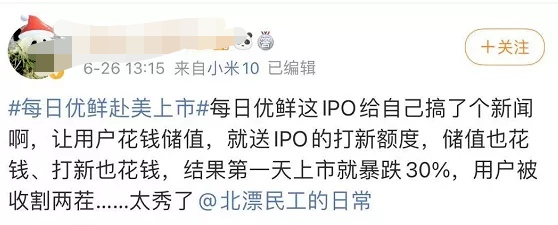 令人意外的是,首日破发竟然还不是每日优鲜这次上市最大的槽点,网上骂声一片的是这家公司IPO时充值送新股的活动。周日一整天,网上都充斥着对这项活动的指斥与议论。