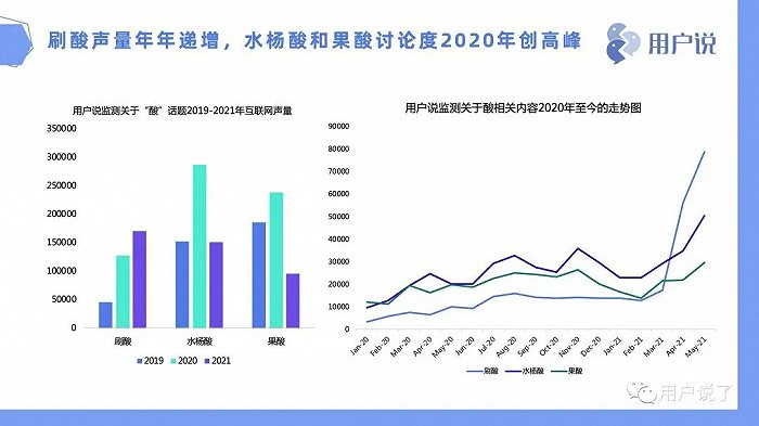 据2019年-2021年的互联网声量显示,刷酸概念从2020年4月开始大幅度走高,环比增长229%,5月持续高涨环比增长40%。同时,刷酸的重要酸类成分之一水杨酸,其讨论量在2020年几乎翻倍增长,药用维A酸在2020年销售增速更是近150倍。