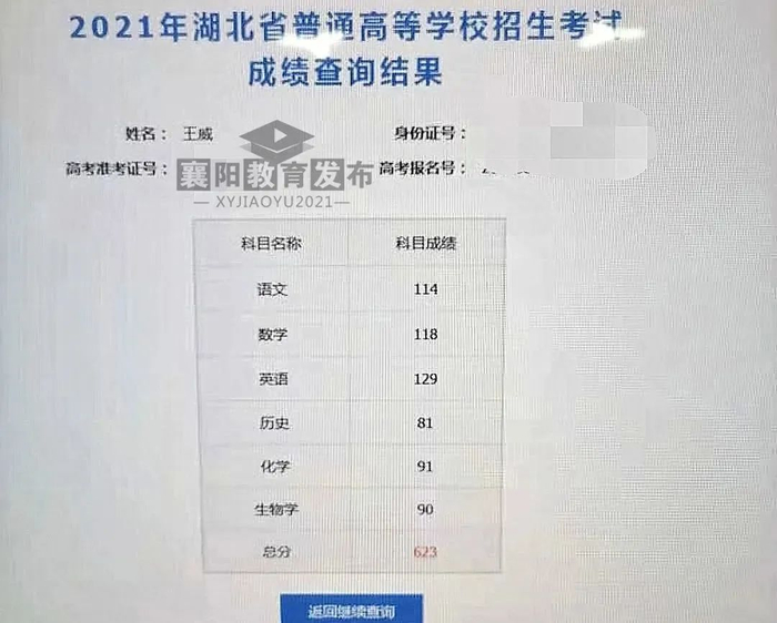 他查到了自己的高考成绩: