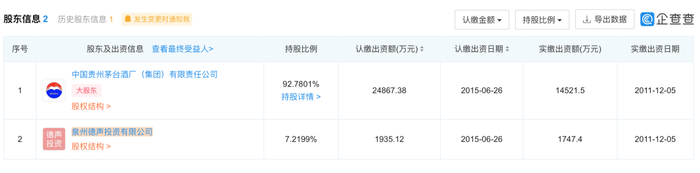 茅台葡萄酒的股东共有两名,其中茅台集团持股比例为92.7801%,泉州德声投资有限公司持股7.2199%。泉州德声注册资本只有1000万元,洪子瑜和洪韵馨两名自然人分别持股50%。