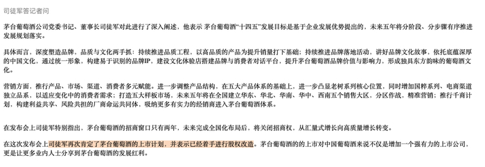 在茅台葡萄酒官方网站中,茅台葡萄酒公司党委副书记、总经理范雪梅在今年4月份的一次活动中表示,茅台葡萄酒将在3-4年时间里,实现茅台葡萄酒主板上市,“通过上市,实现股权改革,整合优势资源,实现茅台葡萄酒高质量发展。”
