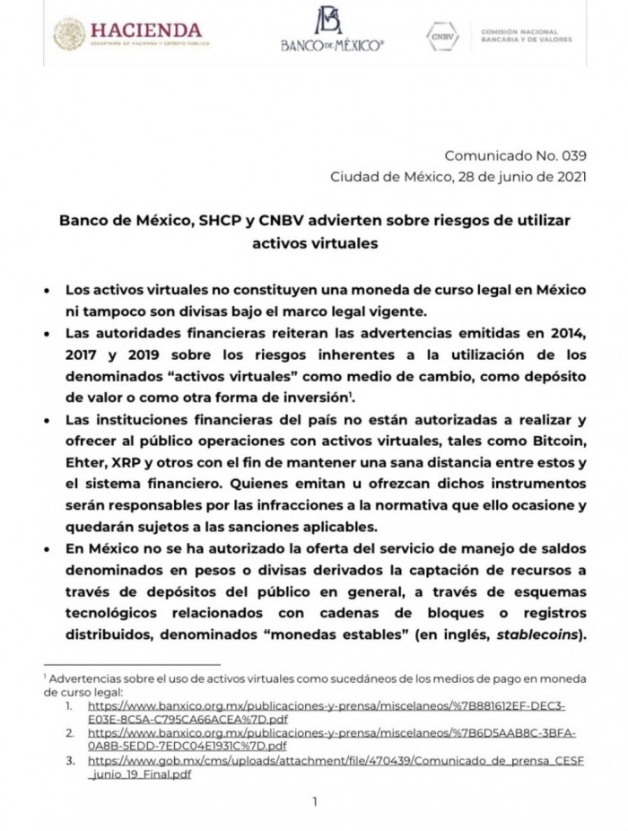 周一,墨西哥央行发表声明称,比特币等加密货币不是法定货币,禁止在该国的金融体系中使用。声明称:“当局重申,关于使用所谓的‘虚拟资产’作为交换手段、价值储存或另一种投资形式的内在风险,墨西哥的金融机构无权开展和向公众提供比特币、以太币、XRP等虚拟资产的业务。”