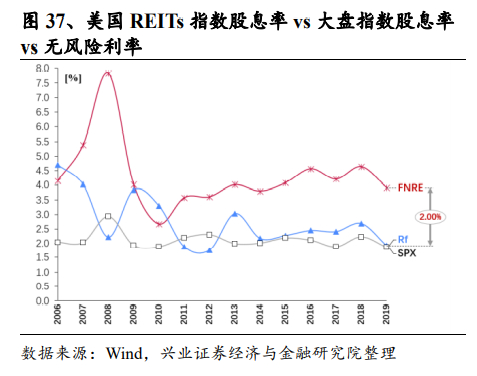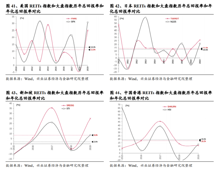 从长期来看,REITs产品整体回报率与权益产品较为接近。比如,从2009到2019年间,美国 REITs产品(FNRE指数)历年总回报率在-4.1%~29.0%之间,十年间年化总回报率约 11.6%,同期标普500(SPX指数)历年总回报率在-4.0%~31.6%之间,十年间年化总回报率约 13.3%。日本、新加坡、中国香港市场的数据也反应出了这一特征。