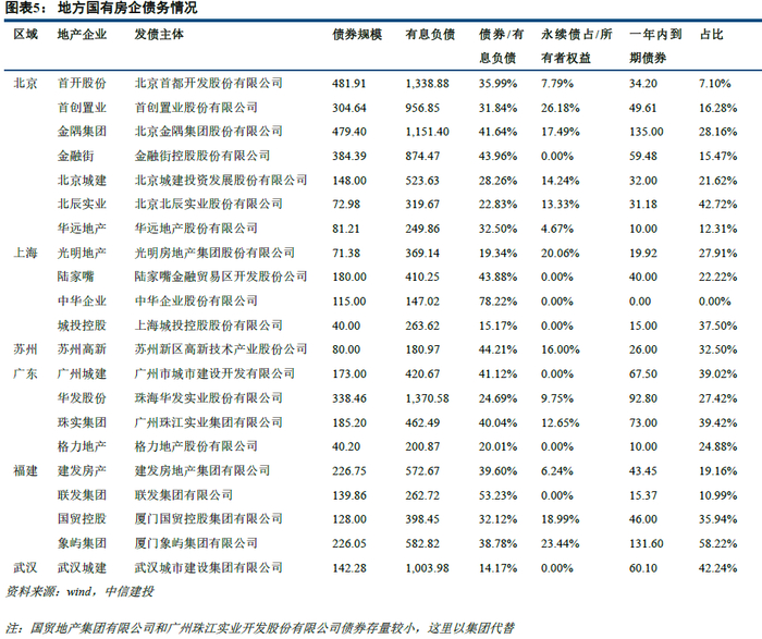 稳健房企偏爱直融,高杠杆房企依赖银行。根据统计,金隅集团、金融街、陆家嘴、中华企业、苏州高新、广州城建、珠江实业集团、建发房产、联发集团的债券余额已经接近或超过了有息负债的40%,这些企业财务数据通常较为稳健,偏爱直接融资与较低的发债成本相辅相成。而一些高杠杆房企例如、首开、首创、北京城建、华远地产、光明地产、华发股份的债券余额占有息负债的比重不高,尤其考虑到华发和首开项目出表的负债以银行贷款为主,也从侧面反映出对银行的依赖程度较高。