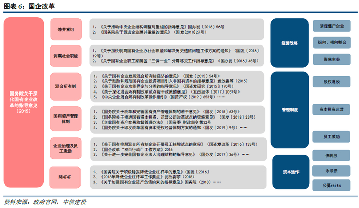 4、国企改革是影响国有房企发展的重要因素。国企改革形成了以2015年发布的《关于深化国有企业改革的指导意见》为统领、以35个配套文件为支撑的“1+N”政策体系。回顾国企改革历程,主要从三个层面上齐头并进:1、行业经营层面的操作包括企业的兼并重组,剥离社会职能、聚焦主业等,改革的核心目标是去产能,促进产业升级;2、管理制度层面的操作包括国有资本投资、运营公司的改革、国企股权混改以及员工持股激励等,改革的核心目标是聚焦治理机制、用人机制、激励机制,提升企业活力和效率;3、资本运作层面的操作从资产负债表入手,包括负债端的债转股,权益端的永续债增厚权益,以及资产端的公募Reits,核心是去杠杆。