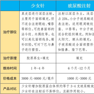 相比于注射美白、玻尿酸等传统美容疗法,上海华美医疗美容医院表示,相比于注射美白技术,少女针见效快,持续效果更加持久。北京圣嘉新医疗美容医院表示,相比于玻尿酸注射,少女针在注射后不易移位,且副作用较小。临床表明,1支Ellansé®少女针增加胶原蛋白体积约等于3-4支玻尿酸效果。但同时,少女针注射层次较深,注射难度高,培养医生需要一定时间。