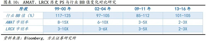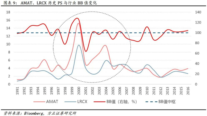 2007 年之后, 两家公司的 PS 中枢值有所下降, 但仍与 BB 值变化表现出较高的关联度。2009-2011 年, 行业 BB 值达 85%-112%, 应用材料、 泛林集团 PS 估值均达 3-5X;2013-2016 年, 行业 BB 值达101%-105%, 应用材料、 泛林集团 PS 估值均达 2-3X。
