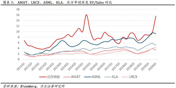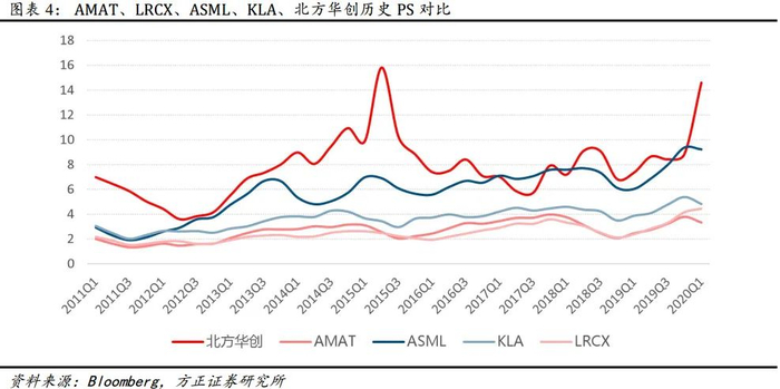对比海外龙头厂商发展历史, 我们认为北方华创 PS 估值相较其中枢值应有显著溢价。我们认为其合理 PS 估值为 12-15X。
