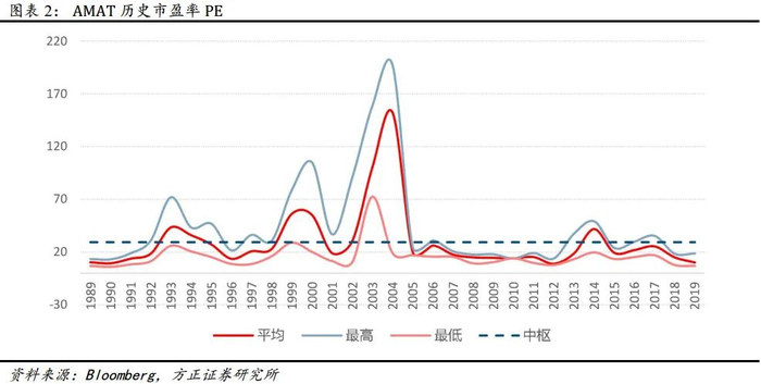 从市盈率 PE 估值来看, 应用材料公司在 2007 年之前, 即内生增长、 外延扩张阶段, PE 呈现较大的波动性。其中 2004 年峰值 PE 曾达到 152X。2008 年后, 即业务成熟阶段后, PE 估值逐步趋于稳定, 具备较强的估值参考价值。2007 至 2019 年公司的平均 PE 约 18X, 表现为随行业景气度波动。1989-2019 年, 近三十年来看 AMAT 的 PE 中枢约为 29X。