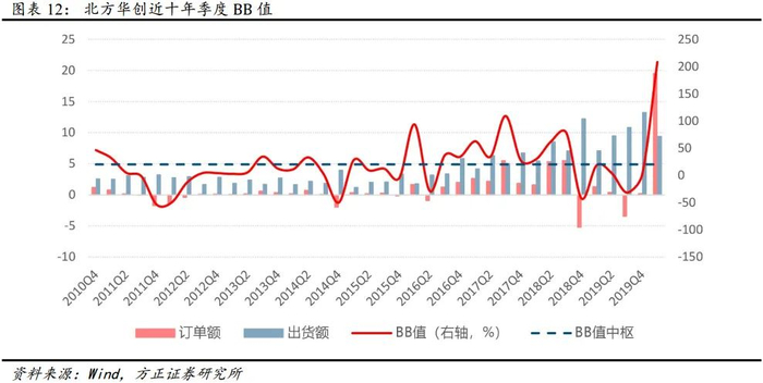 16Q3 随着业务整合完成,公司的出货额稳步提升。订单额在 18Q3之前总体稳定增长,18Q4-19Q4 由于外部宏观环境导致的景气度波动,订单额出现偶发性季度内下降, 并且整体也处于较低的金额水平, BB值亦出现显著下滑。但 20Q1 随着订单额的显著改善, BB 值出现快速回升, 达 208%, 表现出较高的景气度。整体来看 10Q4-20Q1 北方华创自身的订单 BB 值中枢为 20%。