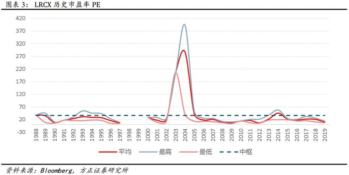 以美国泛林集团(LRCX) 为例, 历史 PE 亦呈现较大波动, 其中2004 年峰值 PE 曾达到 393X。2006 年后其 PE 估值逐步趋于稳定,1989-2019 年, 近三十年来看, LRCX 的 PE 中枢约为 36X。