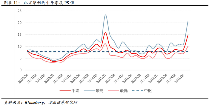 选取 2010Q4 至 2020Q1 北方华创的季度 PS 估值数据, 2016 年后随着七星电子及北方微电子业务整合的完成, 公司的 PS 估值逐步趋于稳定, 波动性减弱, 16Q3-19Q4 的 PS 估值中枢为 7.7X。10Q4-20Q1的整体估值中枢为 7.8X。