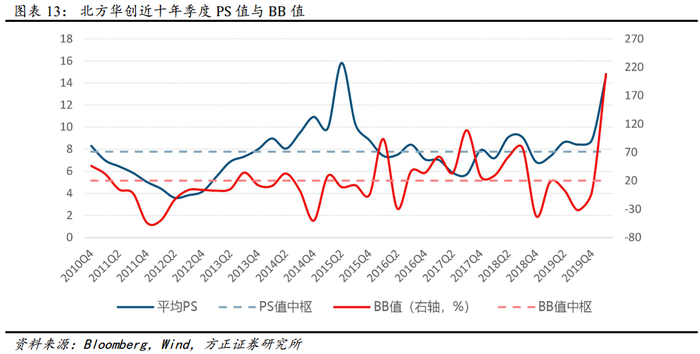 将北方华创 2010Q4-2020Q1 的 PS 估值与 BB 值对比研究后发现,16Q3 后 PS 估值与公司订单 BB 值具备一定的关联度。20Q1 随着 BB值的提升, PS 估值亦大幅提升。