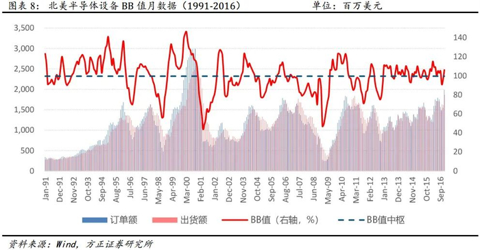 1993-2001 年, 随着互联网应用发展, 半导体设备订单额与出货额大幅增长,BB值波动亦较为剧烈,其中 2000 年 BB值最高达到 146%。