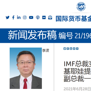 6月29日,国际货币基金组织(IMF)发布消息称,IMF总裁克里斯塔利娜·格奥尔基耶娃28日向IMF执董会宣布,提议任命李波出任副总裁一职,自2021年8月23日起生效。李波现任人民银行副行长,他将接替即将到期卸任的张涛,出任IMF第三位中国籍副总裁。