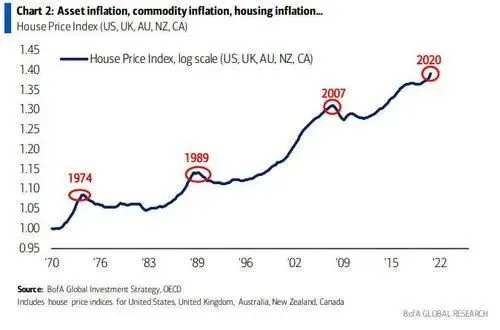 再之后还有住宅膨胀,或者用房地产巨头泽尔曼(Ivy Zelman)的话说,已经可以称得上是「住宅恶性膨胀」了。哈内特指出,房价大涨之风已经吹遍了美国、英国、斯堪迪纳维亚诸国、加拿大、澳大利亚和新西兰,同比涨幅接近30%,可以说是近五十年以来的第四波超级大繁荣了。